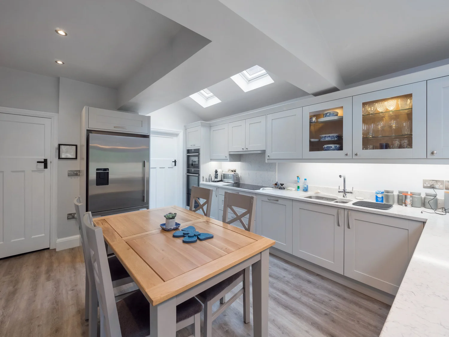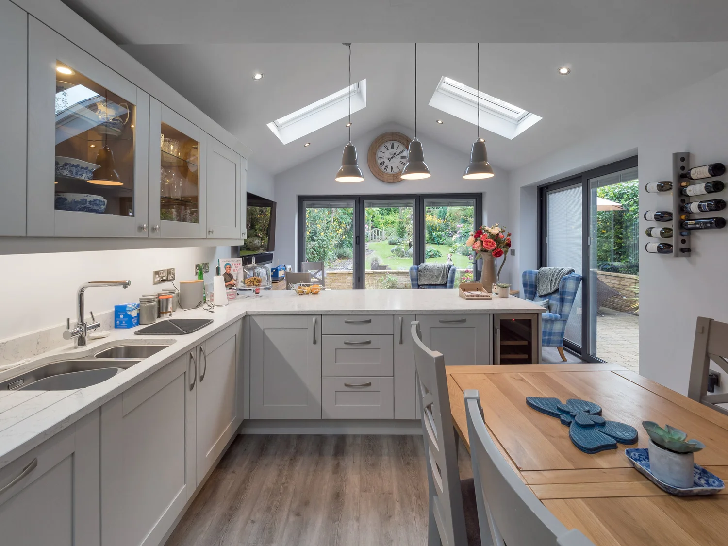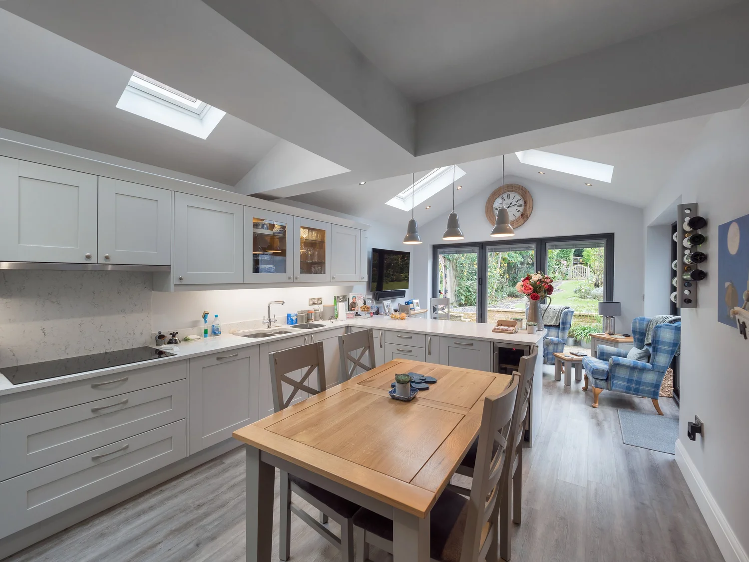 With a dual-aspect layout and carefully positioned roof lights, the space is filled with natural light from morning through to evening. The result is a welcoming, versatile extension that enhances family living and brings a strong connection to the outdoors.