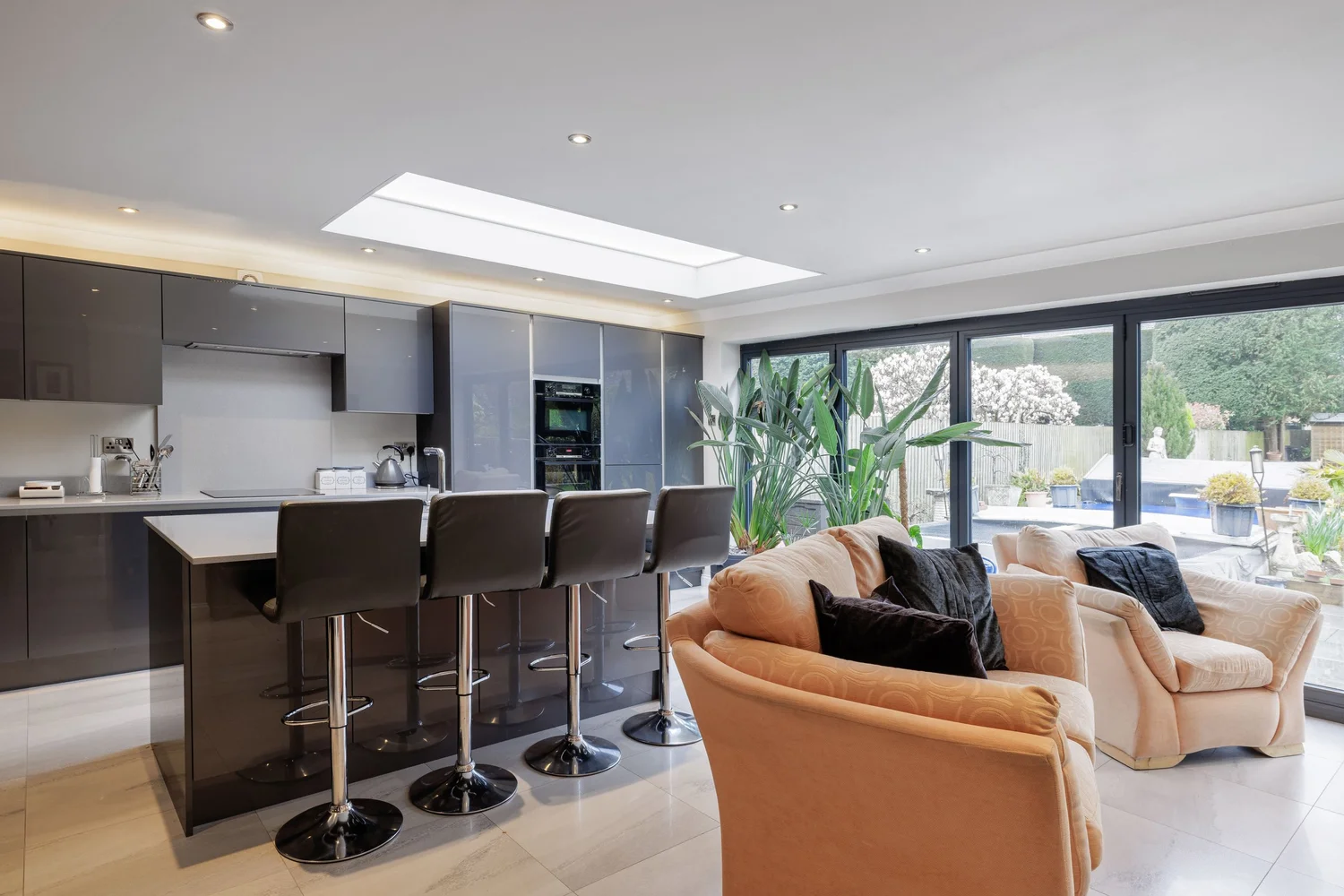 The extension not only enhances day-to-day living but also creates a natural flow between inside and outside, making the large garden a true extension of the home. Modern finishes paired with thoughtful detailing ensure the new addition complements the bungalow while providing a fresh, contemporary feel.