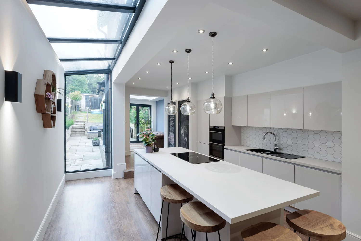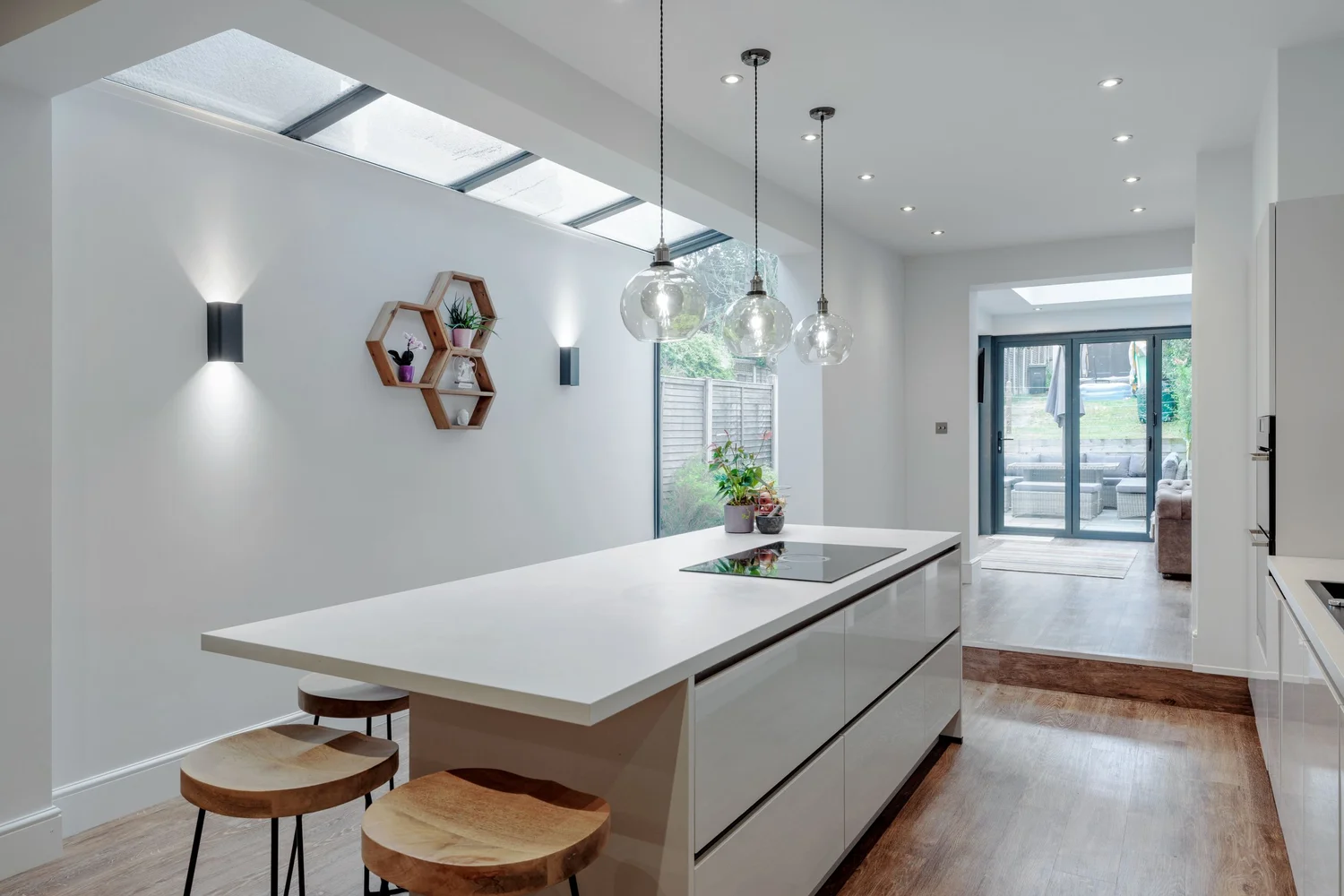 This terraced home in Mere Green was transformed through a rear extension and loft conversion, designed to meet the needs of a growing family. The rear extension created a bright, open-plan kitchen, dining, and living space, with large glazed doors bringing in natural light and opening the home to the garden.