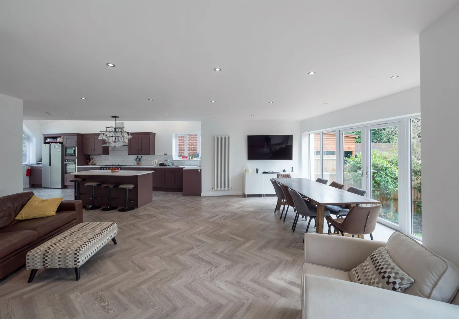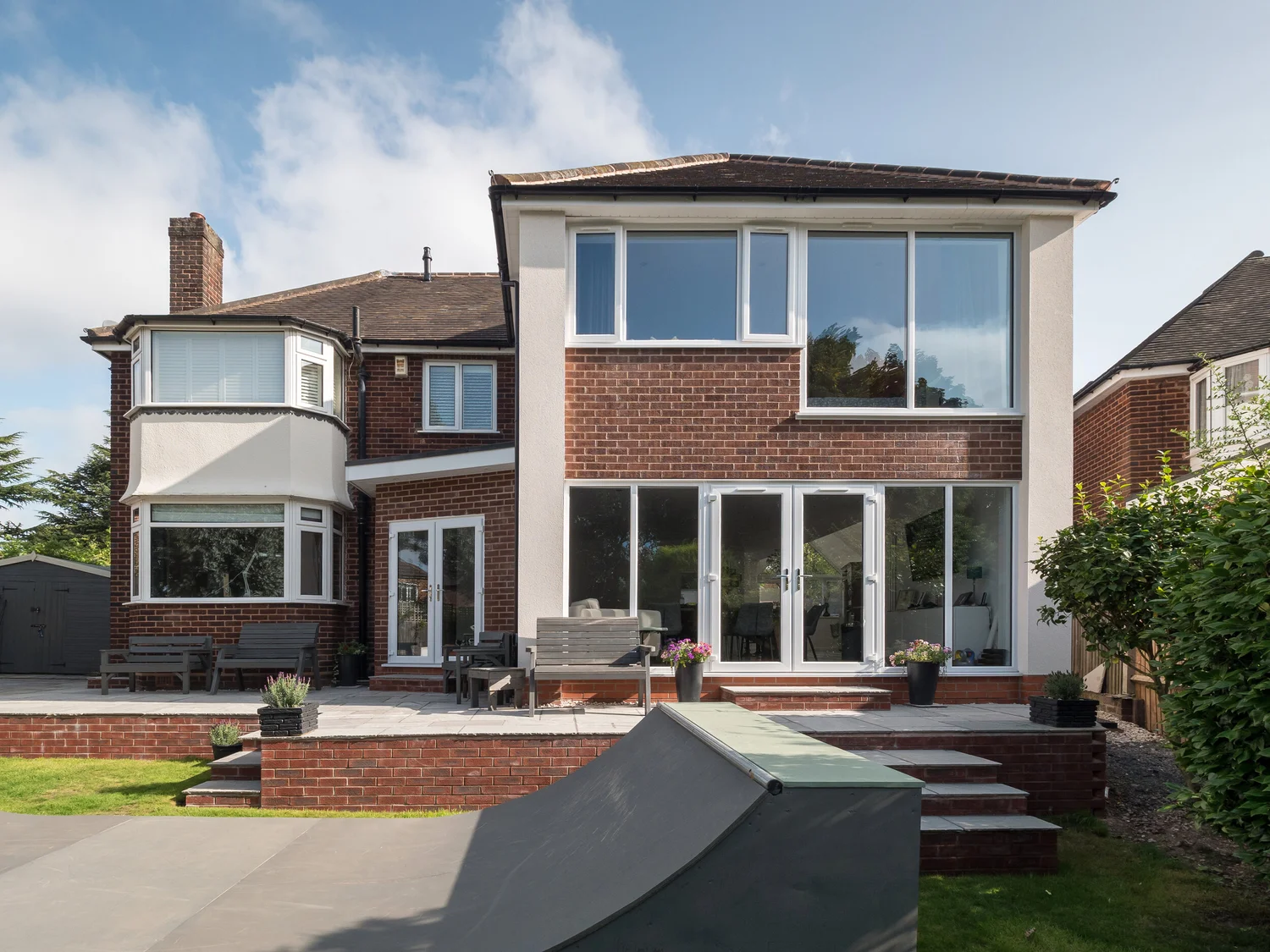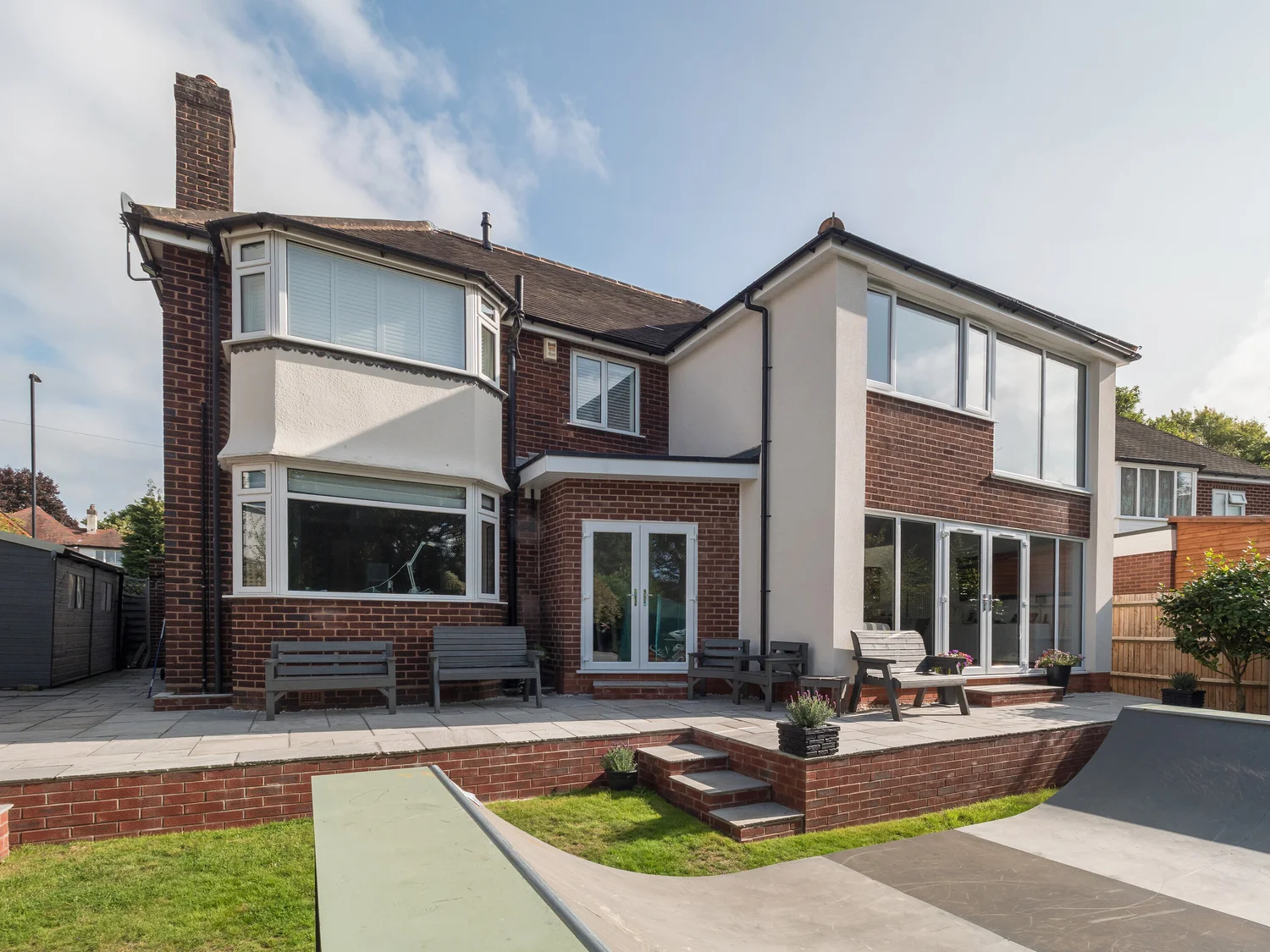 From the front this extension looks traditional and marries into the original aesthetic of the period property. The use of render ensures the original form of the building remains intact. Contrasting materials not only stop poorly matched materials but help break the buildings appearance into focal bays and a level of visual interest. The rear of the building has a more modern form to compliment the skate ramp in the garden. Internally, the open plan living space provide a hub for this vibrant family.