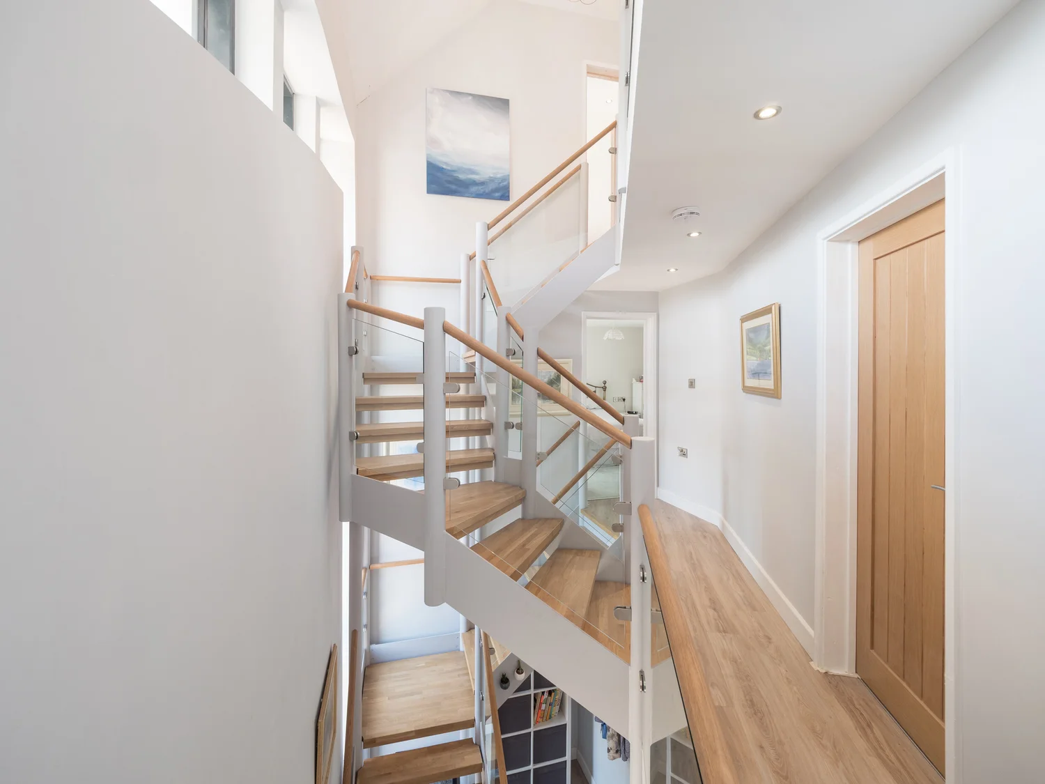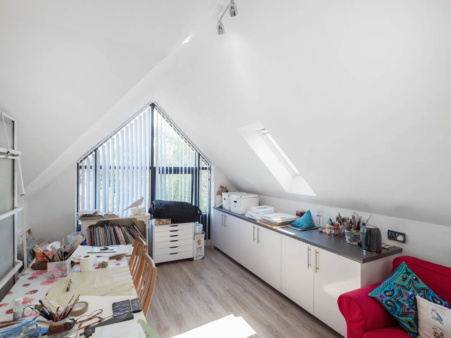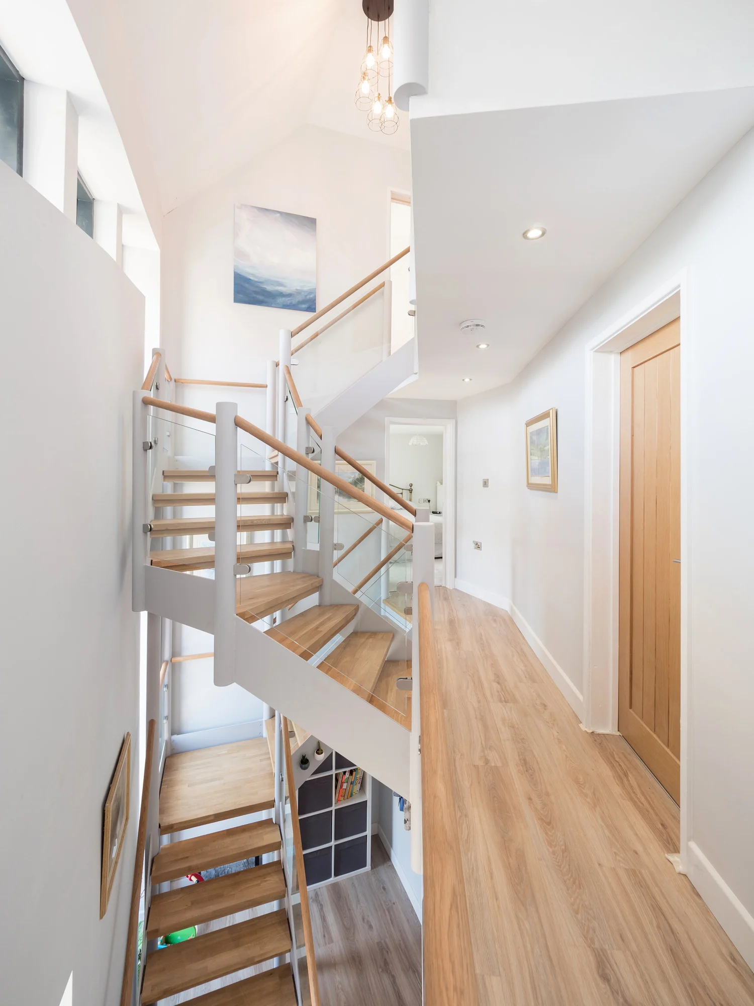 A playful and bright artist’s studio sits atop the house in the roof space, with the full height hallway and feature stair playing the main part. Bedrooms lead off from the landings in this full height space, providing a bright space to enter into at the start of the day.