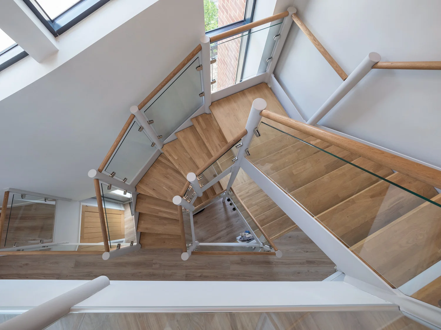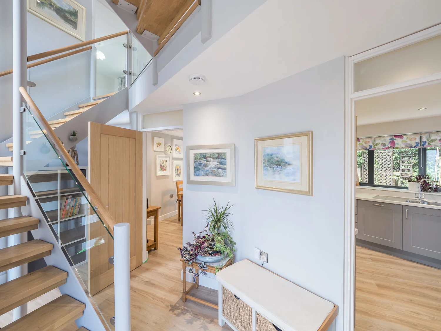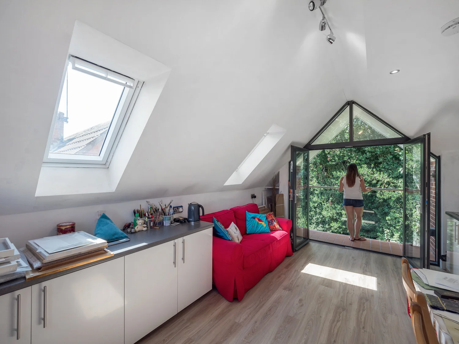 A playful and bright artist’s studio sits atop the house in the roof space, with the full height hallway and feature stair playing the main part. Bedrooms lead off from the landings in this full height space, providing a bright space to enter into at the start of the day.