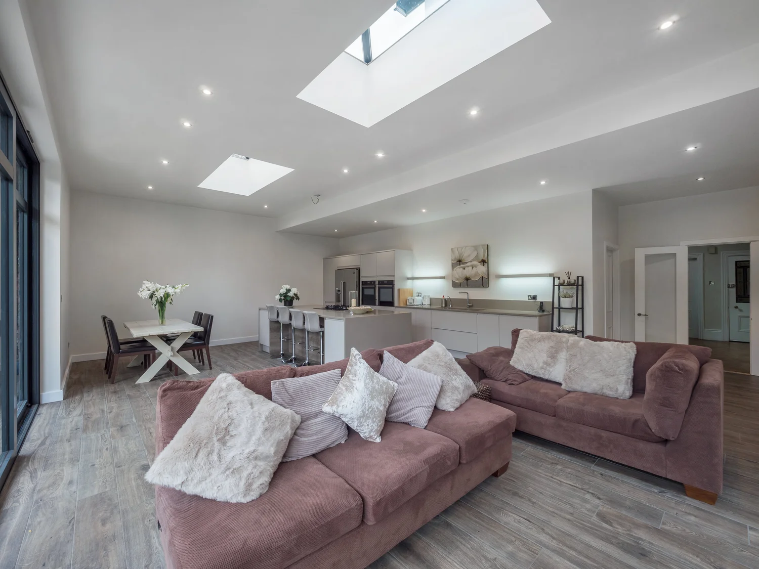 In order to both maintain the character of this Victorian semi-detached home and modernise it, old reclaimed bricks were used along with more modern features; anthracite aluminium bi-fold doors and a robust, overhanging roof profile. Lantern style roof-lights draw daylight directly into the open plan kitchen and lounge. The result is a stylish, classic and modern extension embodying and developing on the character of this townhouse home.
